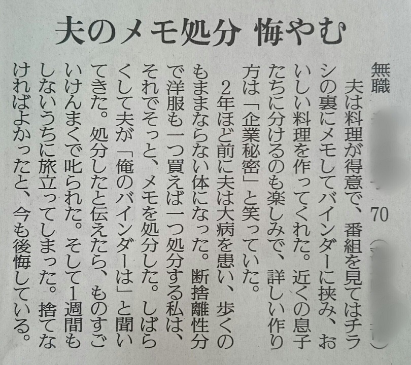 断捨離女さん「夫が大病を患い歩けなくなったので夫の大事な料理メモのバインダーを捨てた」 2020.01.06 0 :ハムスター速報 2020年1月6日 09:05 ID:hamusoku ——— Source: ハムスター速報 断捨離女さん「夫が大病を患い歩けなくなったので夫の大事な料理メモのバインダーを捨てた」