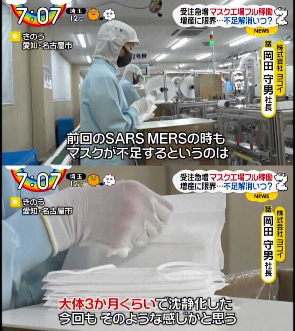 マスクメーカー「1日15万枚マスクつくってる!すぐ沈静化する」 転売厨死亡へ 2020.02.05 1: エントモプラズマ(茸) [US] 2020/02/04(火) 11:10:15.33 ID:nZf6M8EF0● BE:271912485-2BP(2000) ソース 続きを読む ——— Source: 哲学ニュースnwk マスクメーカー「1日15万枚マスクつくってる!すぐ沈静化する」 転売厨死亡へ